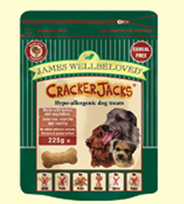 Cereal free CrackerJacks are naturally delicious, made from wholesome lamb or turkey, potato, peas and tomato, seasoned with parsley and thyme. They are hypo-allergenic, containing no beef or pork, and no dairy products as they are ingredients which may cause many food allergies in dogs.