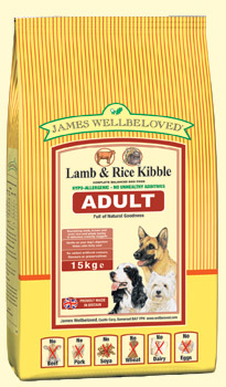 Wholesome, natural hypo-allergenic dog food. Helps loose bowels and calms itchy, irritated skin and coat.Regular feeding with lamb and rice has always been the traditional way to calm a dog’s digestion and help avoid allergic skin irritation. James Wellbeloved Lamb & Rice Kibble is a pure, natural, complete dry food of succulent lamb and brown rice. Barley is also added as a source of fibre and seaweed, alfalfa and yucca all bring health benefits.
