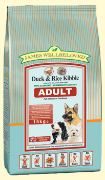 Wholesome, natural hypo-allergenic dog food. Helps loose bowels and calms itchy, irritated skin and coat. They use lean, easily digestible duck because it is a tasty, novel source of protein for dogs. James Wellbeloved Duck & Rice Kibble is a pure, natural, complete dry food which uses organic oats as a source of fibre. Seaweed, alfalfa and yucca are also added for the health benefits they bring.